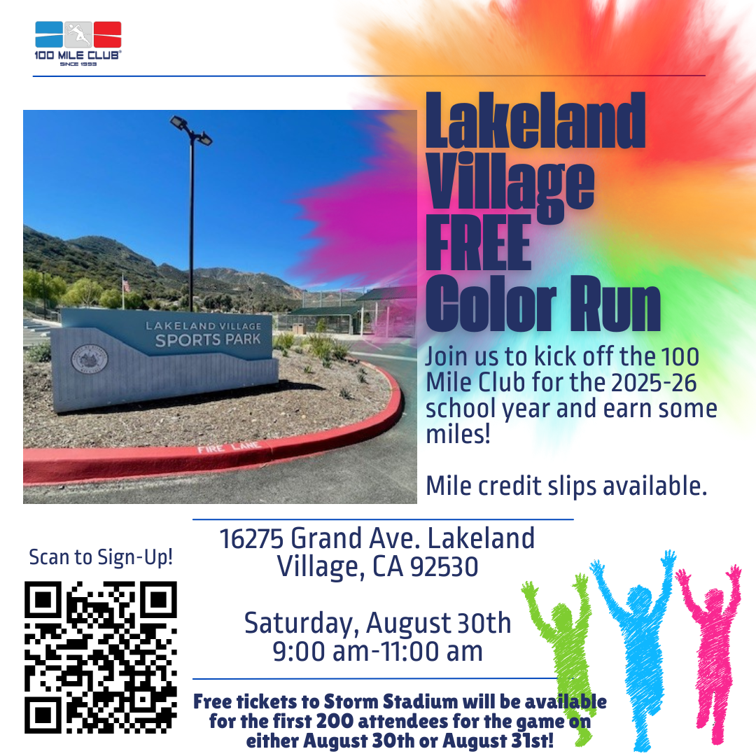 Lakeland Village 16275 Grand Ave, Lake Elsinore, United StatesKickoff Event for the 2025-2026 school year to help kick start miles and advertise for Lake Elsinore residents. FREE tickets to Storm Stadium will be available for the first 200 attendees for the game on either August 30th or August 31st! Visit Facebook Event for more details: https://fb.me/e/5Kg7qmeix?mibextid=wwXIfr Children must be accompanied by an adult – no drops […]