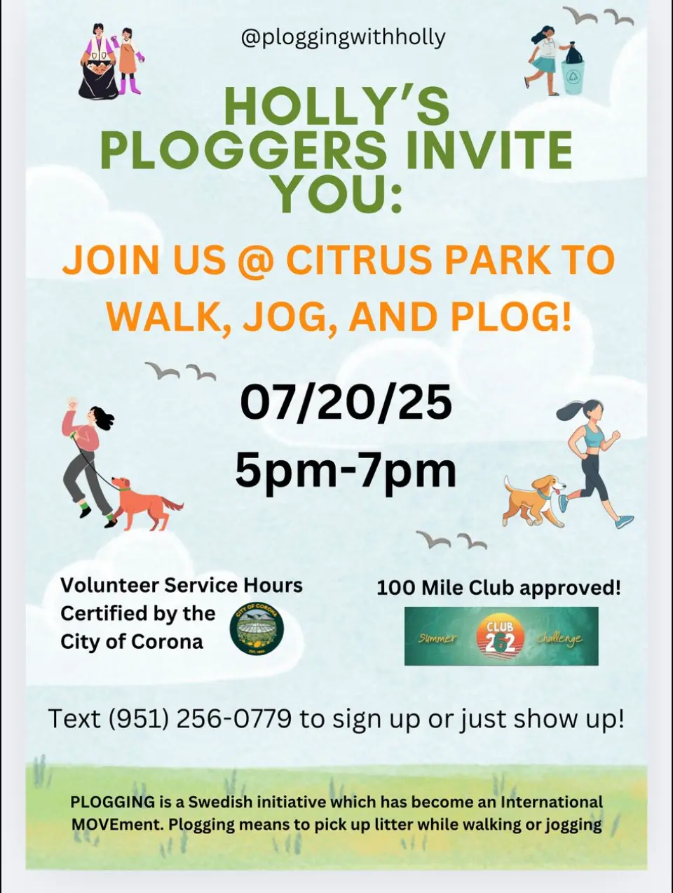 Citrus Park 1250 Santana Way, Corona, United StatesJoin us as we PLOG, WALK & JOG helping Clean up Citrus Park as we get MOVING Together!! Children must be accompanied by an adult – no drops offs. Miles counted only for posted time of meet-up. Always check the calendar on day of event for changes, weather, cancelations, etc.